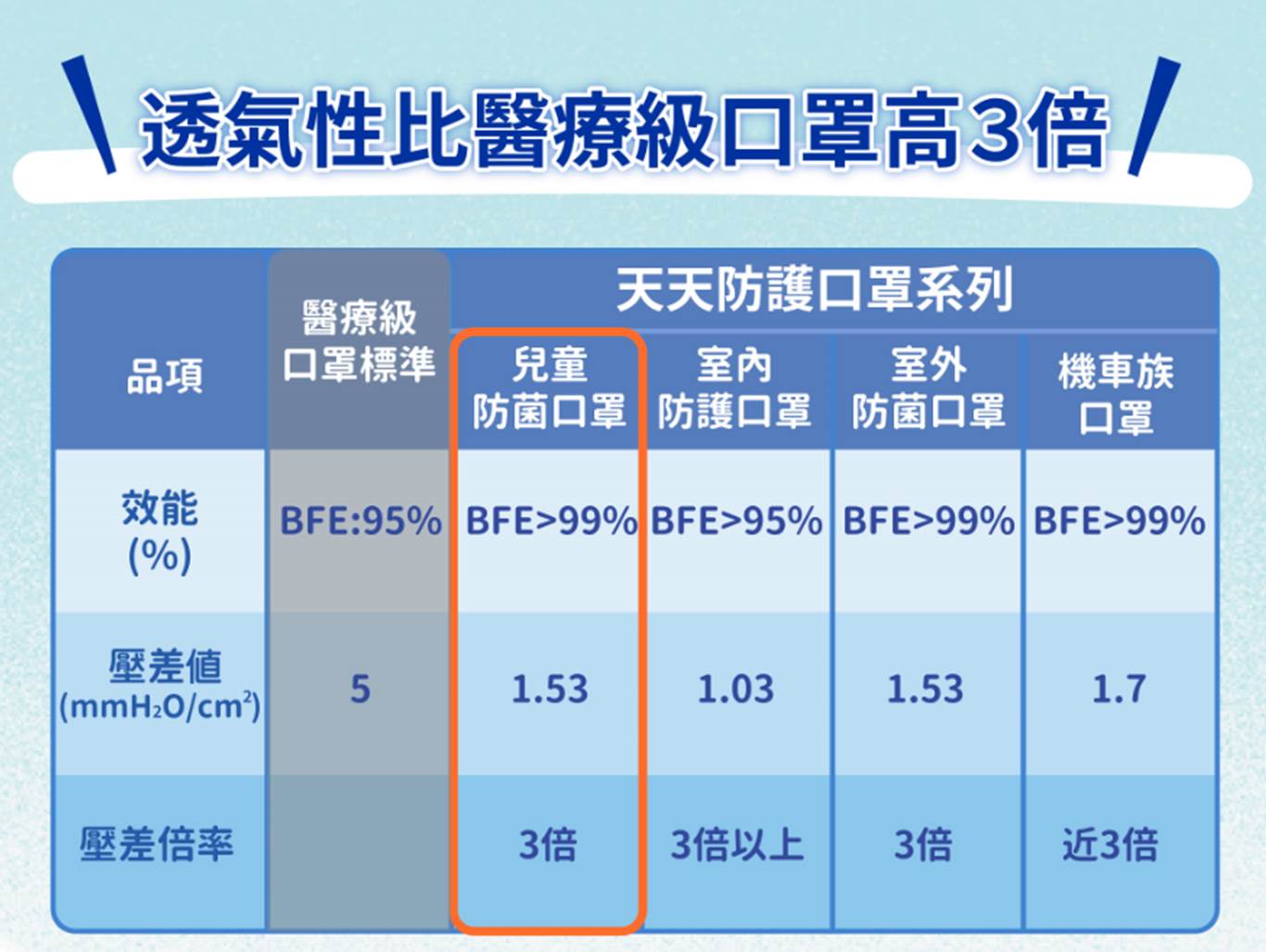 天天兒童防菌醫用口罩透氣性是一般醫用級口罩的三倍,三倍透氣呼吸更順暢!