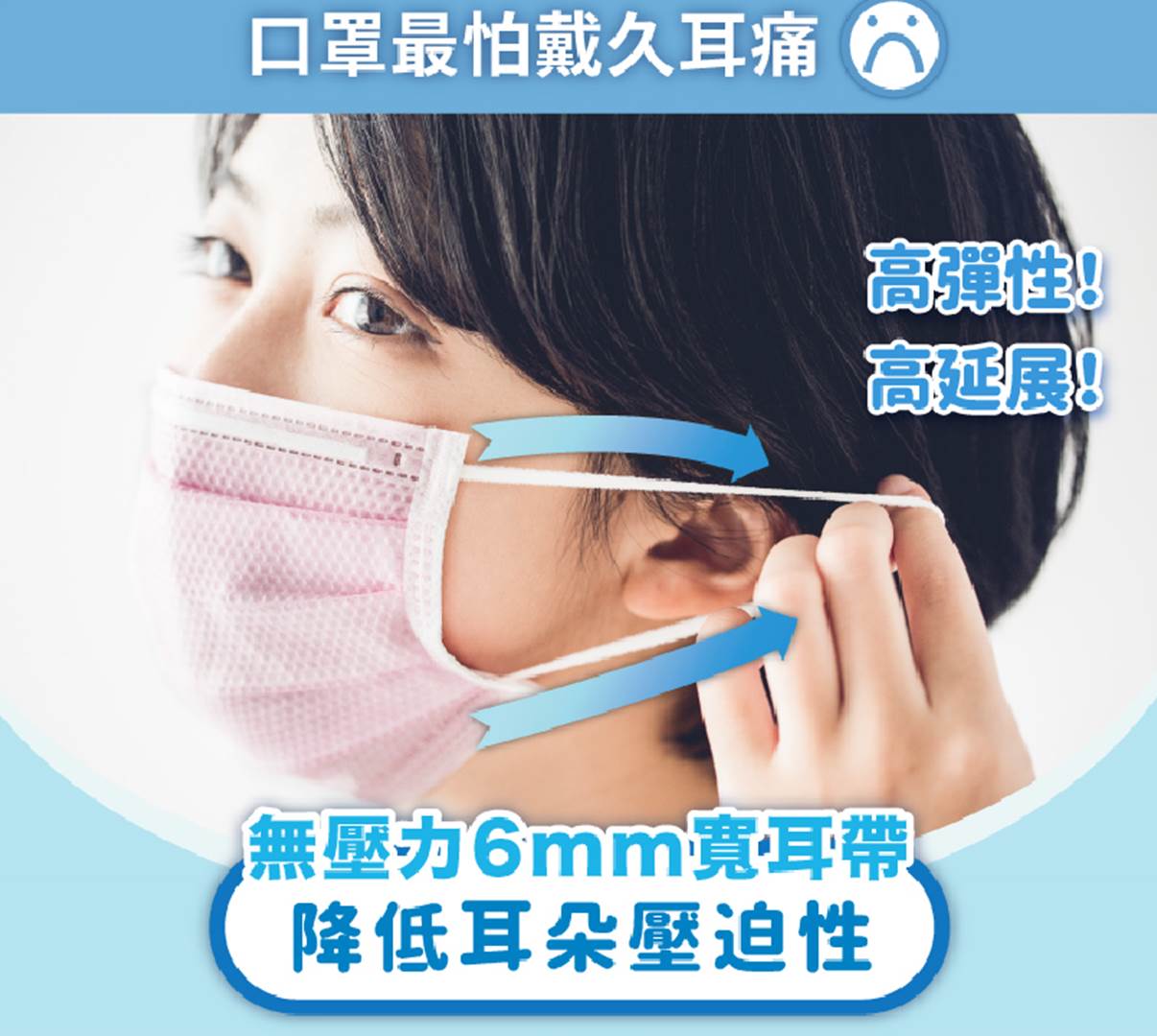 天天口罩用的耳帶,採用6mm寬版的耳帶,可以讓耳帶的壓力平均分散在寬耳帶面上,因此耳背承受到的壓力就會減少,就算久戴也不會痛。