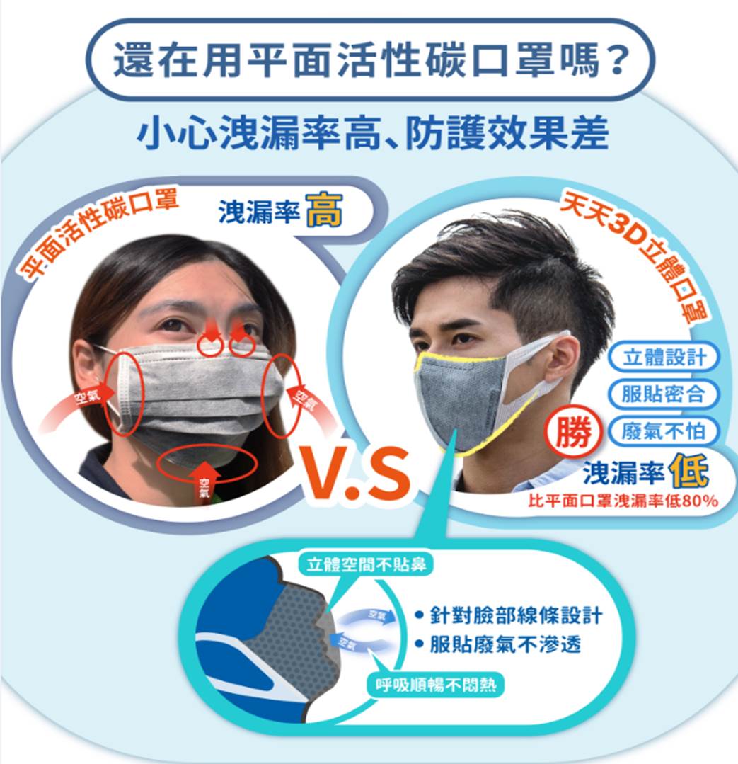在密合度上,3D立體口罩會比平面口罩佳,因此當暴露在惡臭、廢氣環境中建議配戴3D立體口罩阻擋惡臭廢棄。