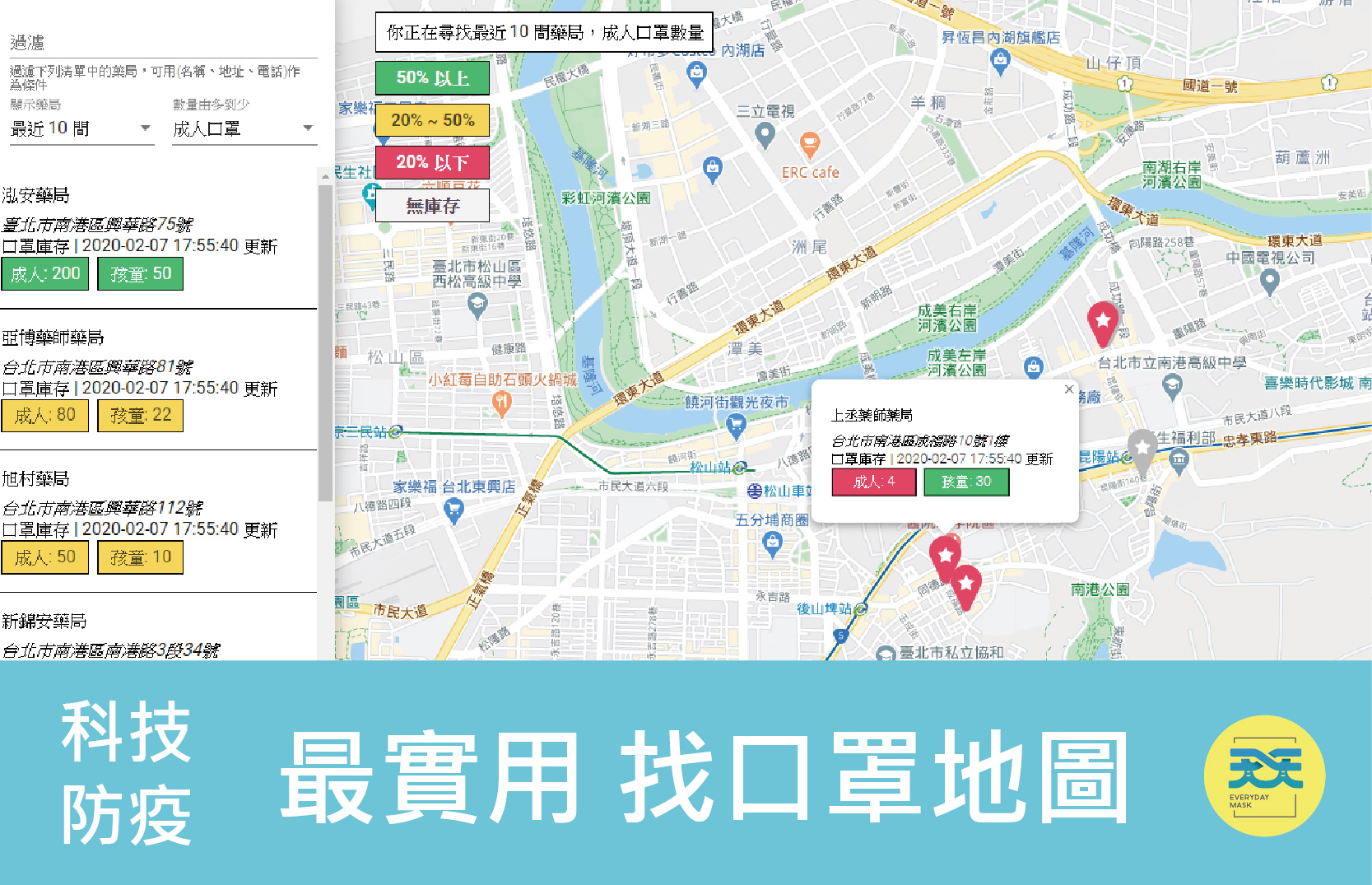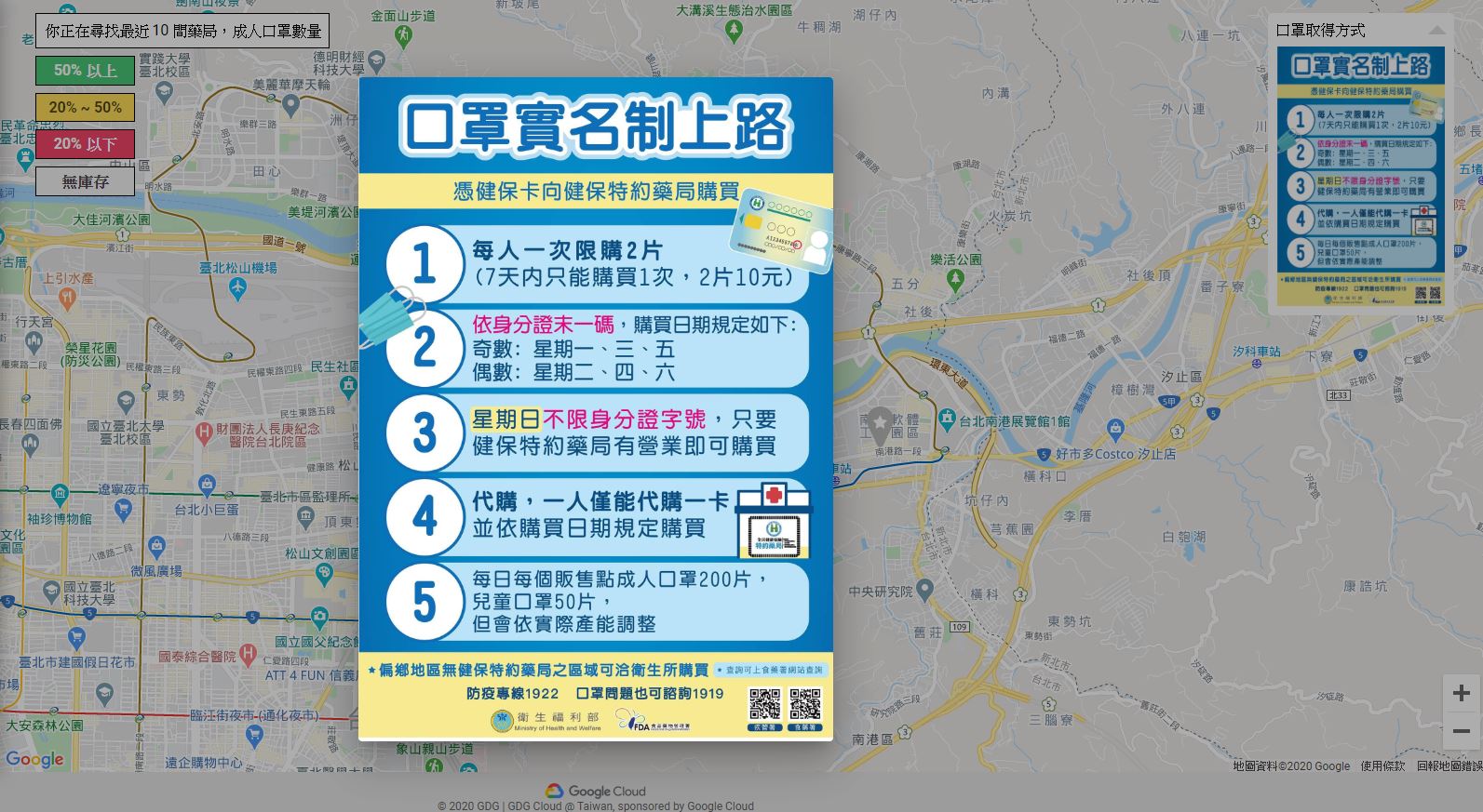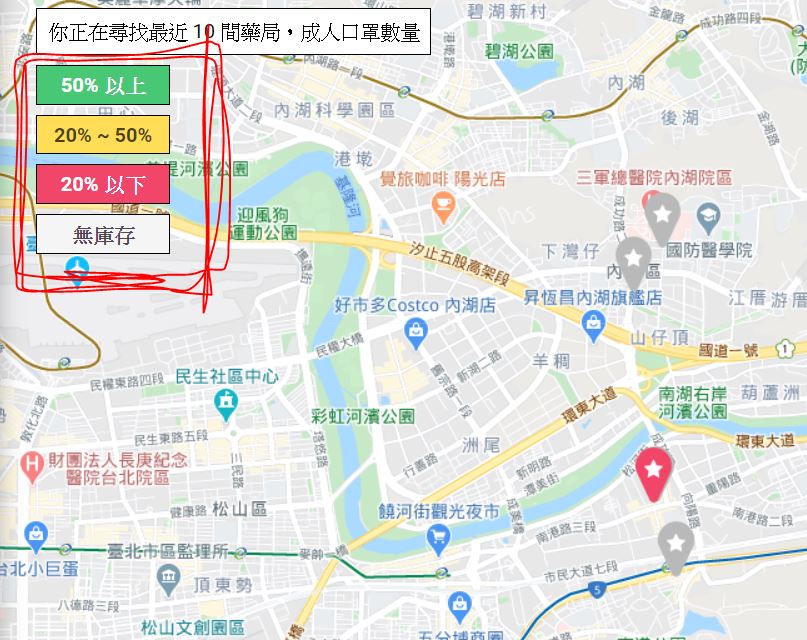 網頁版本 即時口罩地圖 https://mask.goodideas-studio.com/ ※點選右上角,有領取口罩的小提醒 ※地圖上的顏色表示庫存量 灰色表示無庫存 / 紅色表示庫存量低 LINE版本 敗口罩(LINE ChatBot) https://line.me/ti/p/@054ehalj