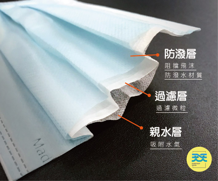 一般醫療平面口罩共有三層,防潑層/過濾層/親水層