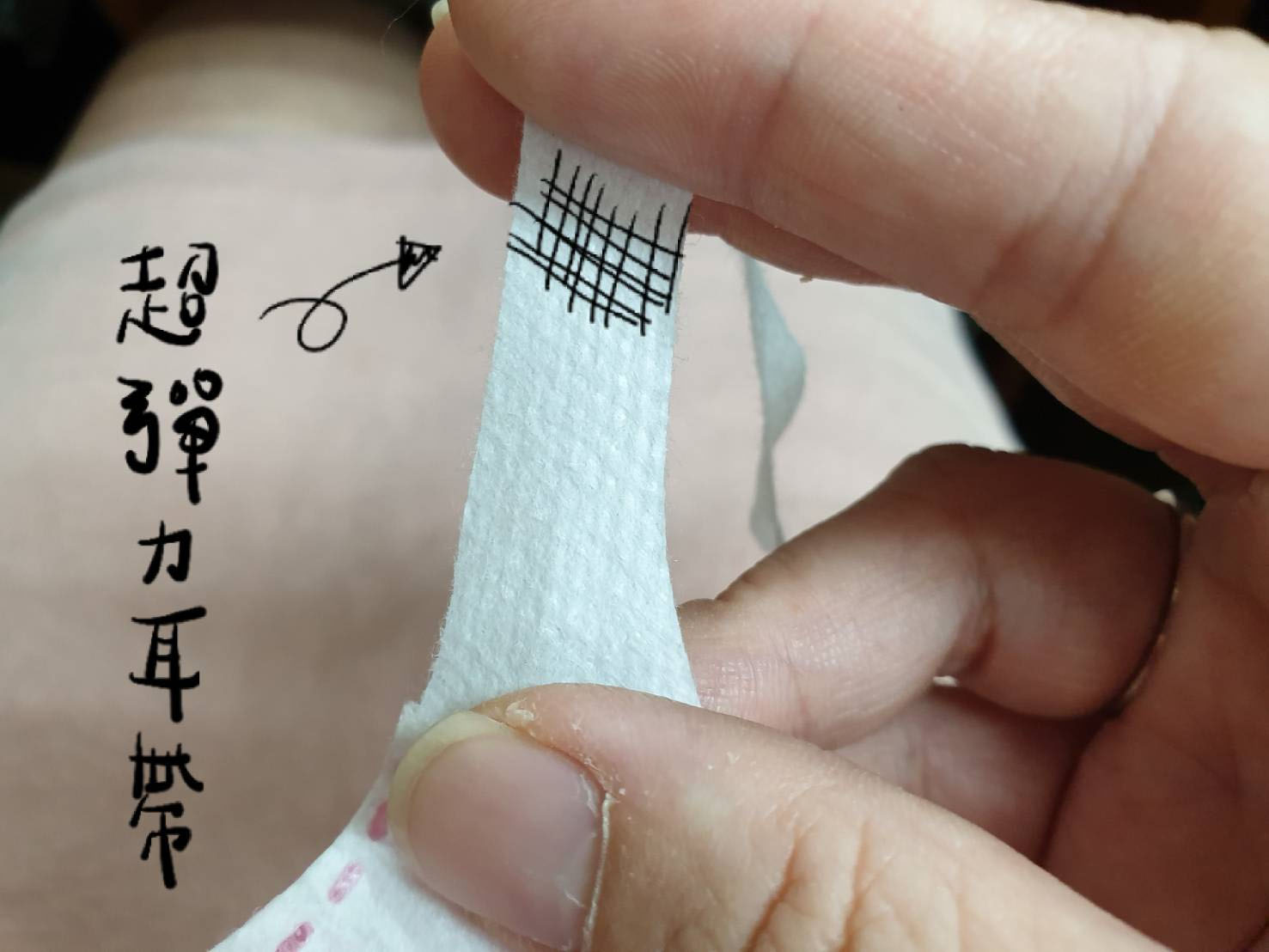 耳帶也是口罩的一個重點,天天的耳帶不是一體成形容易扯斷,它用心地特別使用了別的材質,拉開後可以看到織網,因此彈性非常非常好,很不容易斷裂!而且不誇張,我女兒有一次一整天戴完放回包包裡不小心跟其他乾淨的混在一起了,我去檢查時還找不出哪個是戴過的,再往上加到90分。